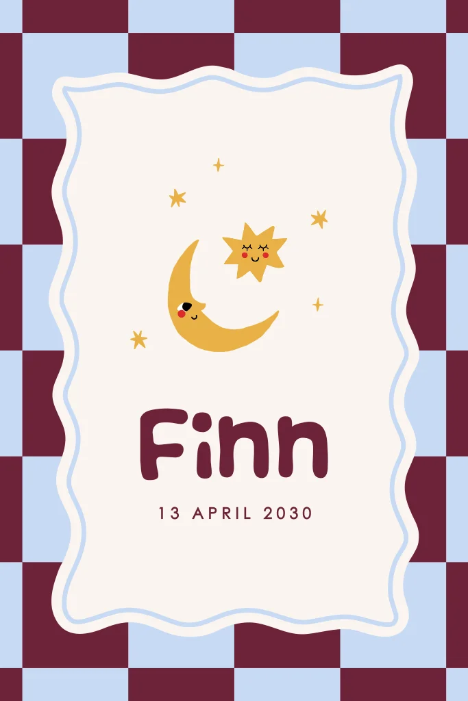 Vrolijk geblokt geboortekaartje met golvend kader en maan en sterren