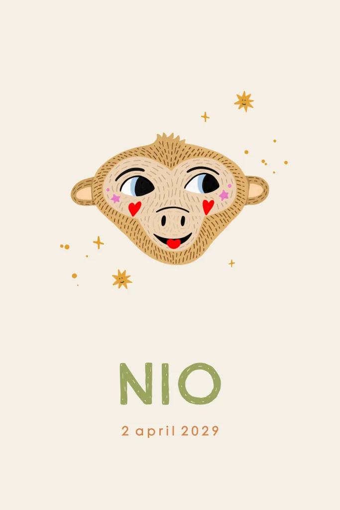 Verwacht je binnenkort een jongetje? Hoe leuk is dit geboortekaartje met aapje! Je past het ontwerp gemakkelijk aan in onze online editor. Wist je bijvoorbeeld dat het ook mogelijk is de letters en elementen in folie te drukken?
