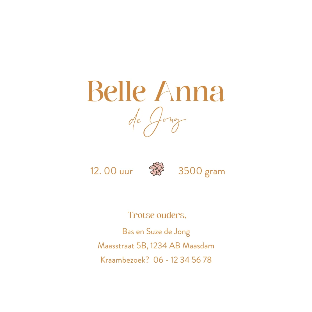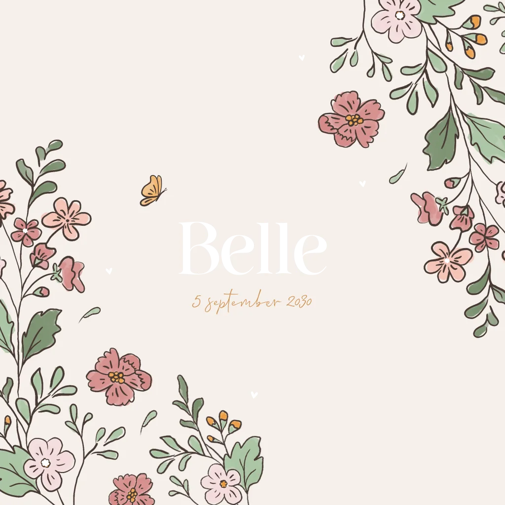 Wat een schattig geboortekaartje voor je kleine meisje! Op het kaartje staan vrolijke bloemen en vlinders. De naam van je kleintje staat in goudfolie voor een luxe finish. Liever een andere kleur? Pas de kaart eenvoudig naar wens aan in de online editor.