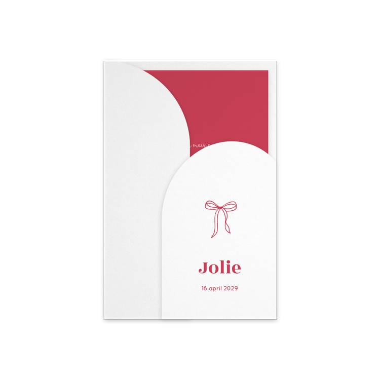 Op zoek naar een mooie geboortekaart voor jullie meisje? Ga dan voor deze toffe geboortekaart in diep roze met strikje. Pas eenvoudig kleuren en lettertypes aan in de online editor. Maak de kaart helemaal speciaal door de bijpassende insteekhoes toe te voegen.