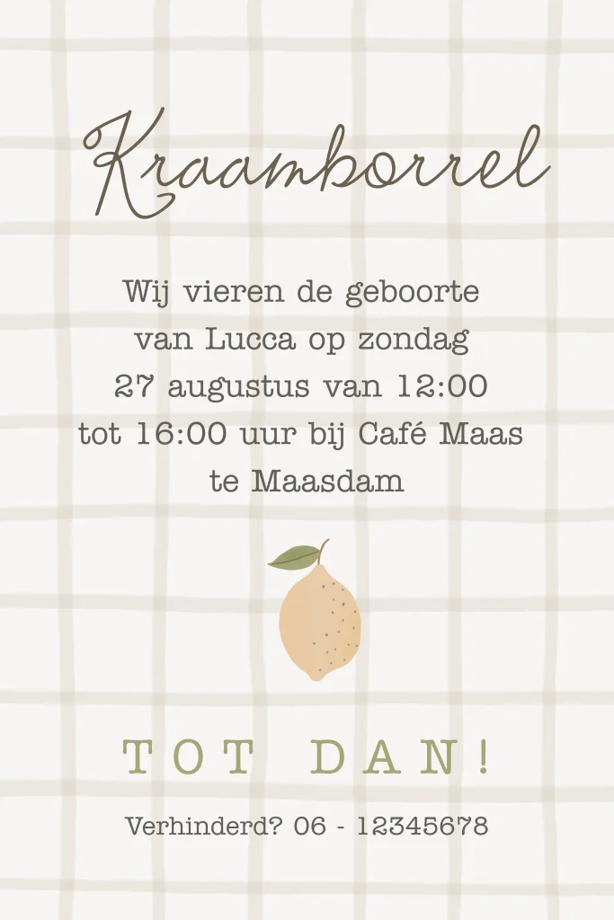 Voeg dit kleine kaartje met citroen toe aan het geboortekaartje van jullie kindje als uitnodiging voor een kraamborrel.