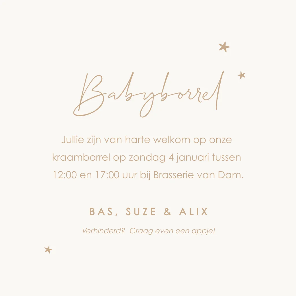 Voeg dit kleine kaartje met mooie sterretjes toe aan het geboortekaartje van je kindje als uitnodiging voor een kraamborrel.