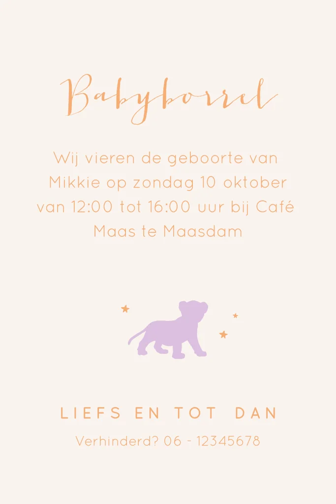 Voeg dit kleine kaartje met lila welpje toe aan het geboortekaartje van je kindje als uitnodiging voor een kraamborrel.