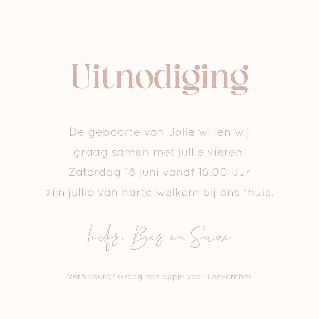 Voeg dit kleine kaartje in oudroze toe aan het geboortekaartje van je kindje als uitnodiging voor een kraamborrel.