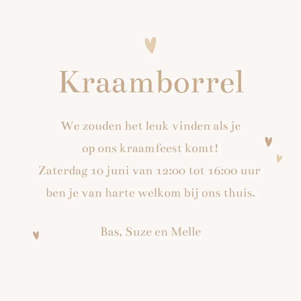 Voeg dit kleine kaartje met hartjes toe aan het geboortekaartje van je kindje als uitnodiging voor een kraamborrel.