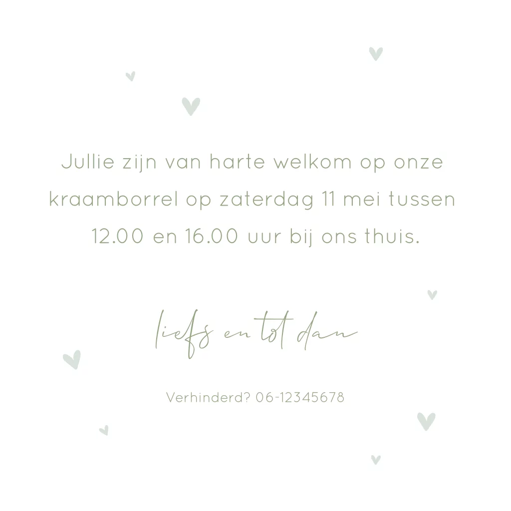 Voeg dit kleine kaartje met schattige hartjes toe aan het geboortekaartje van je kindje als uitnodiging voor een kraamborrel.