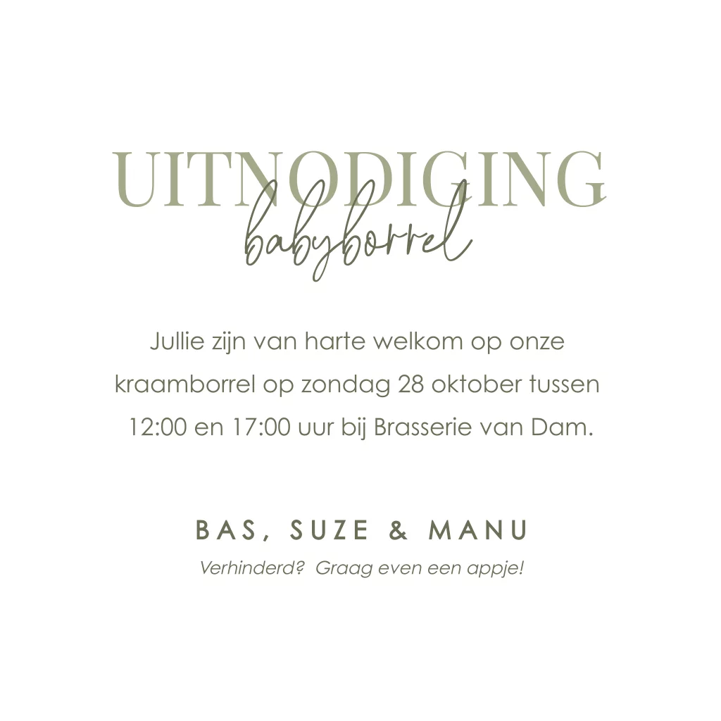 Voeg dit kleine kaartje met stoere typografie toe aan het geboortekaartje van jullie kindje als uitnodiging voor een kraamborrel.