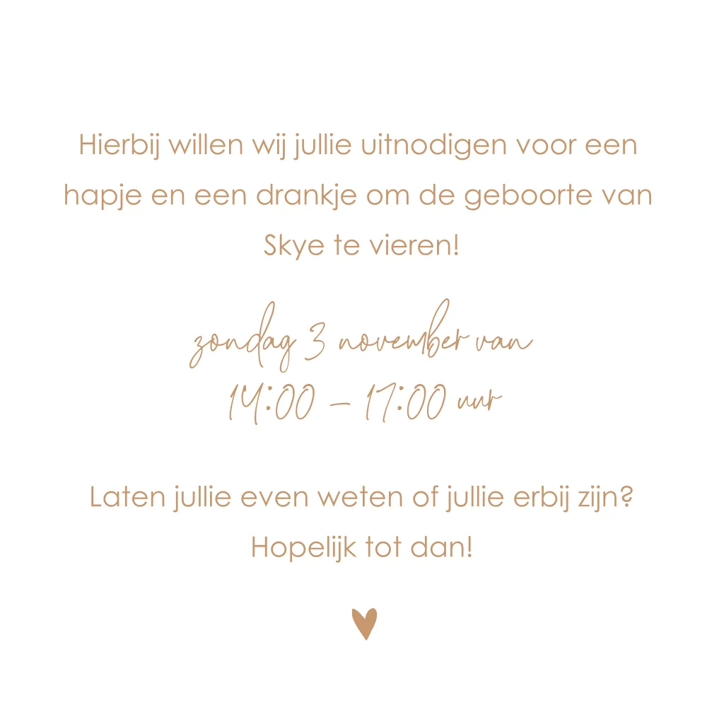 Voeg dit kleine kaartje met neutrale velvetlook toe aan het geboortekaartje van jullie kindje als uitnodiging voor een kraamborrel. Let op: maak de tekst niet te klein!