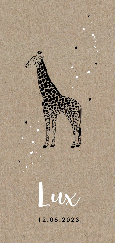 Een prachtig geboortekaartje met unieke illustratie van een giraffe. Het kaartje wordt gedrukt op echt kraft papier, dit zorgt voor een natuurlijke en iet wat stoere uitstraling.