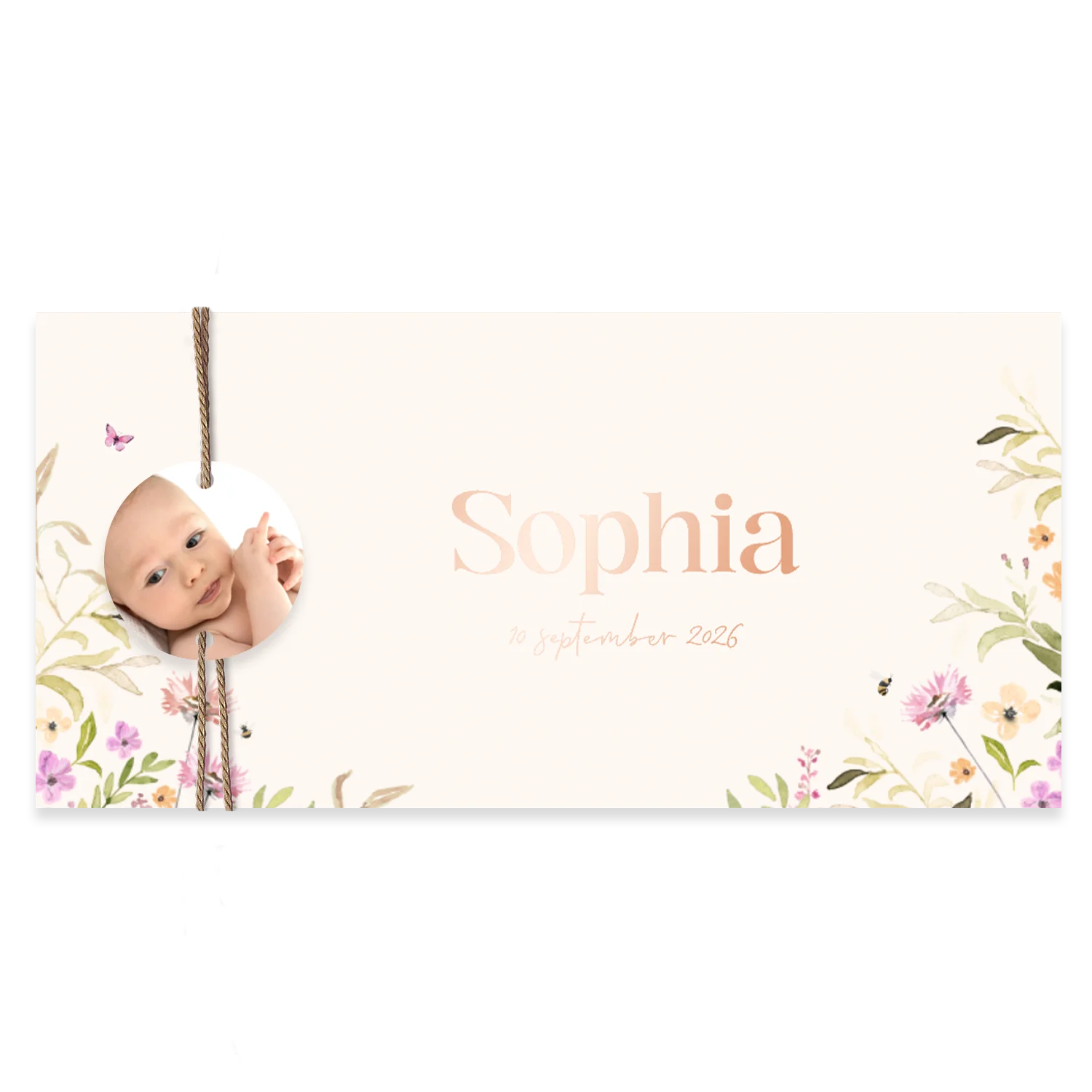 Goed om te weten: het touw wordt niet standaard meegeleverd, dit kun je zelf toevoegen tijdens het bestelproces. Je vindt alle bevestigingsmaterialen hier. Wanneer je de geboortekaartjes ontvangt, kun je het touw er zelf omheen binden.