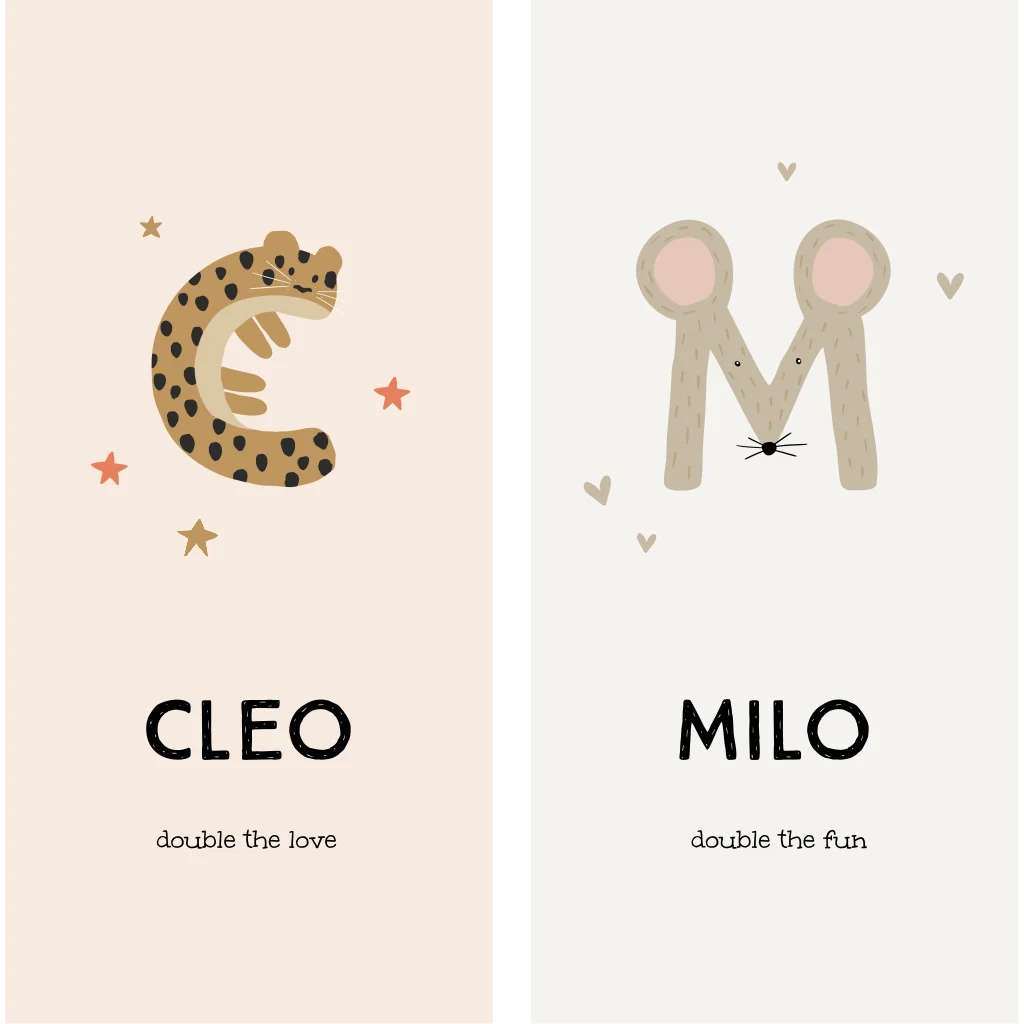 Vrolijke geboortekaart voor tweeling met dierenletters