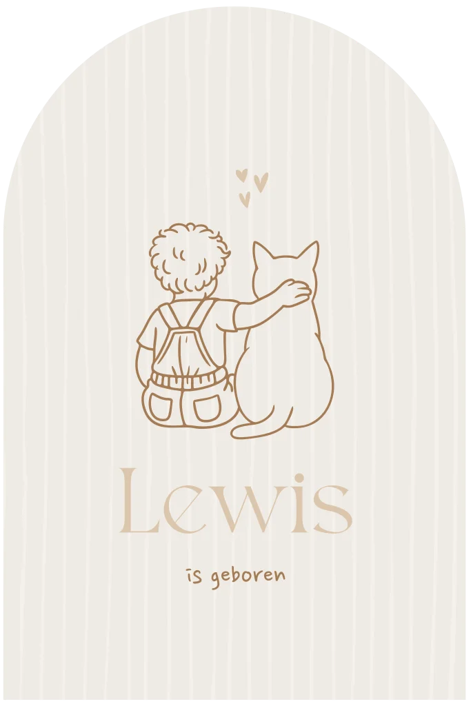 Een lief beige geboortekaartje voor jouw kindje. Het boogvorm kaartje heeft een schattige lijntekening van een kindje naast een kat. Je past de de illustratie gemakkelijk zelf aan naar de juiste hond of kat met de verschillende opties in onze editor. Staat jullie huisdier er niet tussen? Neem dan gerust even contact met ons op via deze link. Dan kijken we graag samen naar de mogelijkheden!