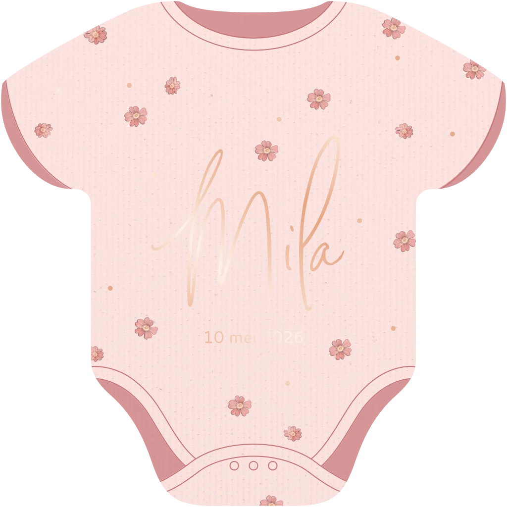 Geboortekaart meisje in rompervorm met roze bloemetjes en roséfolie