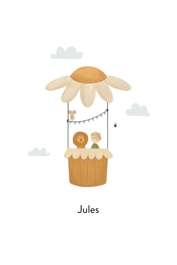 Hoe lief is dit geboortekaartje? Kies voor jullie kleintje een lief geboortekaartje helemaal in lente thema. Op het kaartje staat een bloemetjes luchtballon met een illustratie van een jongetje met een leeuwtje, muis en een bij. Zelf maken geboortekaartje in een originele vorm ovaal.