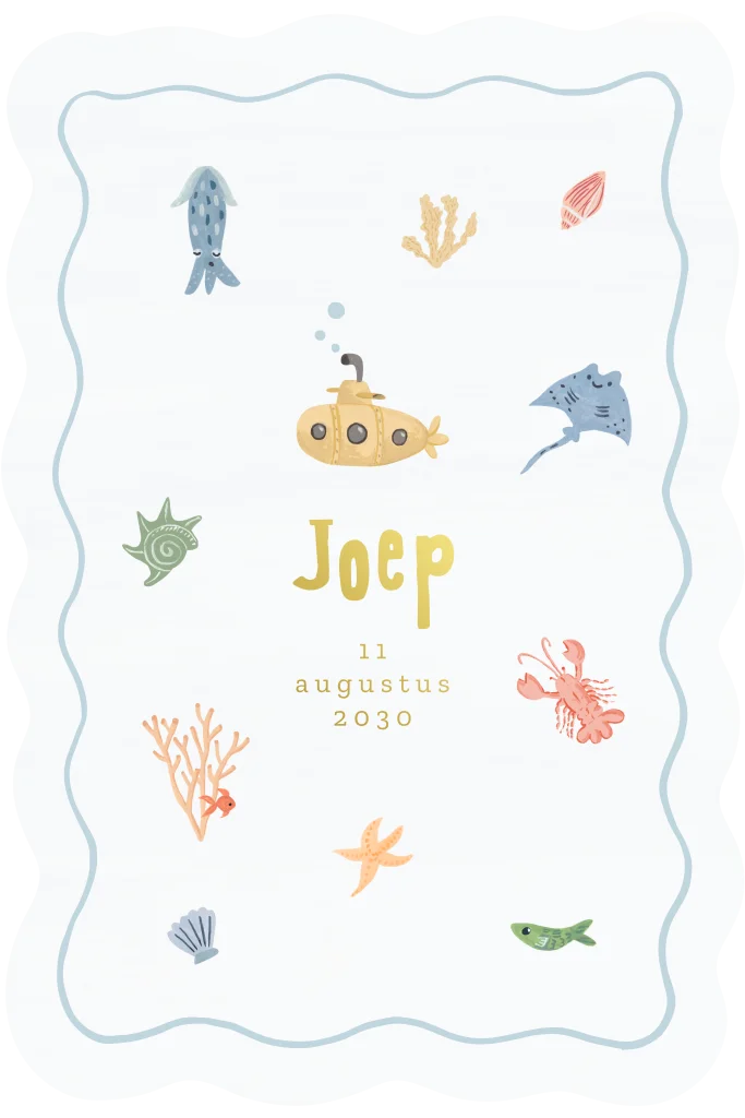 Kondig de geboorte van jullie kleintje aan met dit vrolijke geboortekaartje in originele vorm met duikboot en verschillende zeedieren! De naam van jullie kleintje staat in goudfolie voor een luxe finish. Wil je een lettertype, kleur of ander element aanpassen? Dat kan gemakkelijk met de online editor.