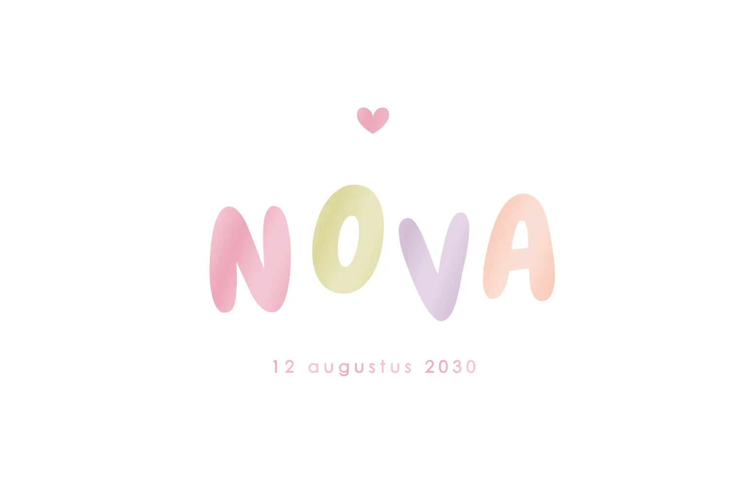 Een trendy geboortekaartje in originele vorm voor de geboorte van jullie dochter! Dit kaartje krijgt een luxe uitstraling door de kleurrijke letters in hoogglans. Pas de tekst en de kleuren eenvoudig aan in de online editor.