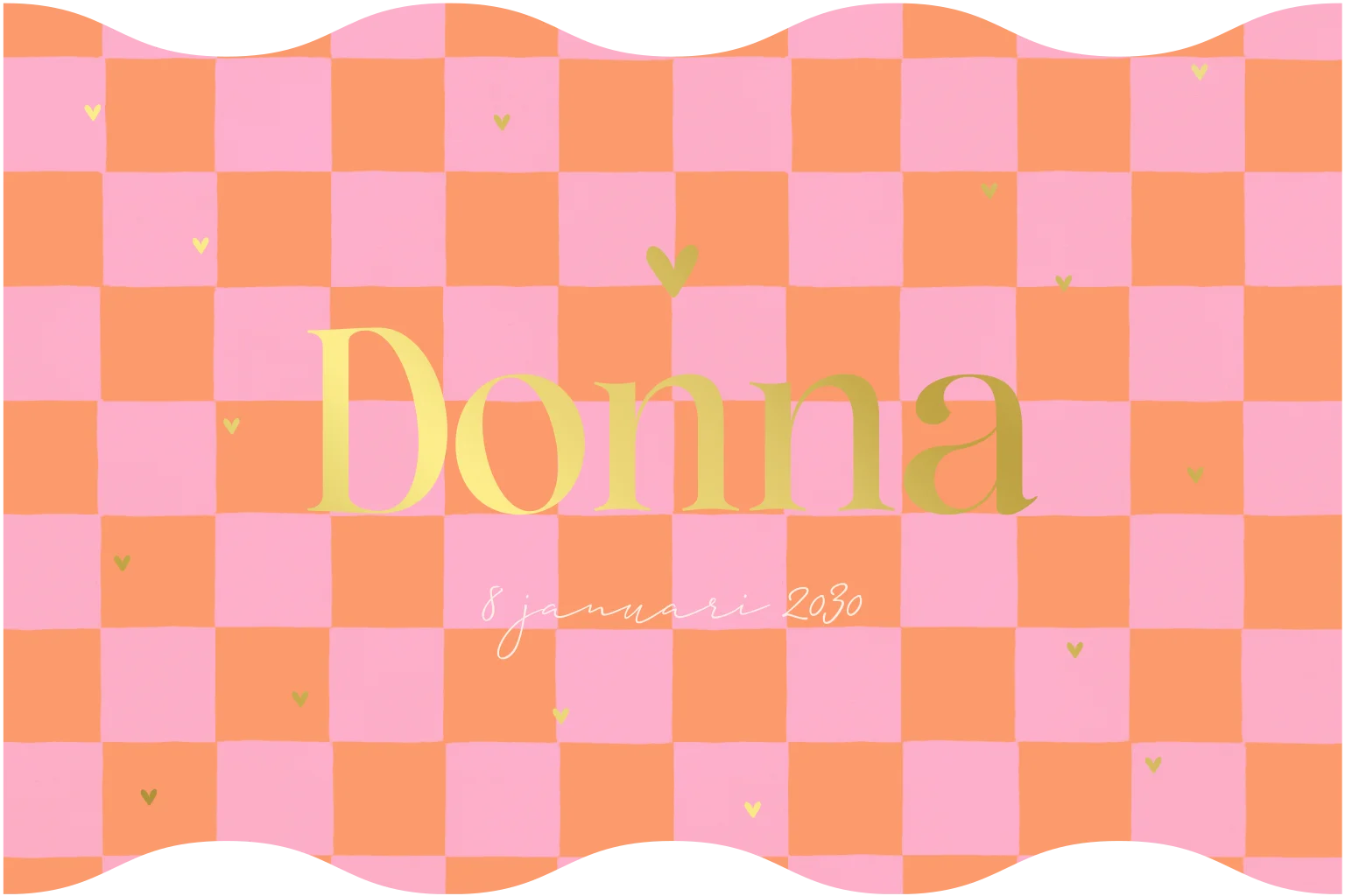 Wat een tof geboortekaartje voor jouw kindje. Het kaartje heeft een oranje/roze geblokte achtergrond met de naam van jullie kleine in goudfolie gedrukt. De vorm maakt deze kaart extra origineel. Pas het ontwerp naar wens aan in onze online editor.