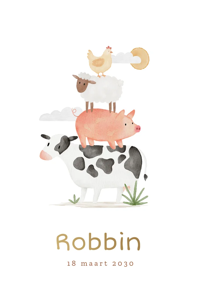 Wat een vrolijk geboortekaartje! Het kaartje heeft een boogvorm en illustraties van verschillende boerderijdieren. De naam wordt gedrukt in mat goudfolie. Pas het kaartje naar wens zelf aan.