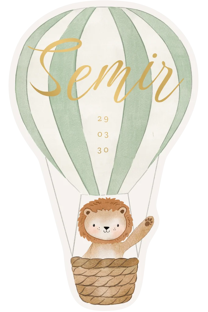 Origineel geboortekaartje luchtballon vorm met leeuwtje en mat goudfolie