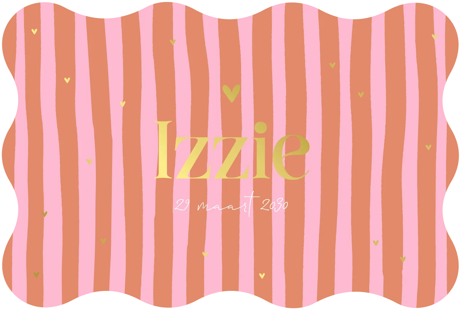Kondig de geboorte van jullie kleintje aan met dit super trendy geboortekaartje met golvende rand en streeppatroon! De goudfolie geeft een luxe finish. Wil je een lettertype, kleur of ander element aanpassen? Dat kan gemakkelijk met de online editor.