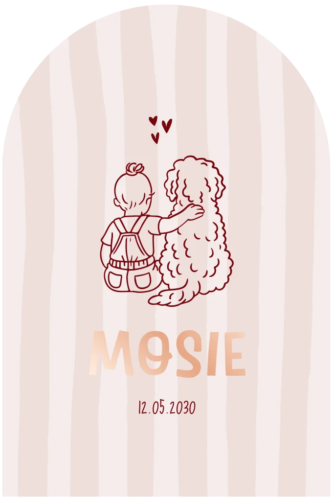 Een lief en uniek geboortekaartje voor jouw kindje. Het kaartje heeft een boogvorm en een schattige lijntekening van een kindje naast een hond. Je past de de illustratie gemakkelijk zelf aan naar de juiste hond of kat met de verschillende opties in onze editor. Staat jullie huisdier er niet tussen? Neem dan gerust even contact met ons op via deze link. Dan kijken we graag samen naar de mogelijkheden!