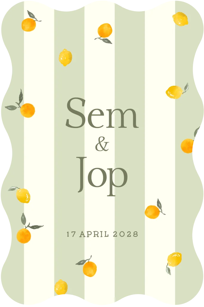 Hier worden we blij van! Een originele kaart om de geboorte van jullie tweeling aan te kondigen. De achtergrond heeft een mooie groene kleur met op de voorzijde stijlvolle strepen en vrolijke citroentjes. Pas tekst en kleuren eenvoudig aan in de online editor.
