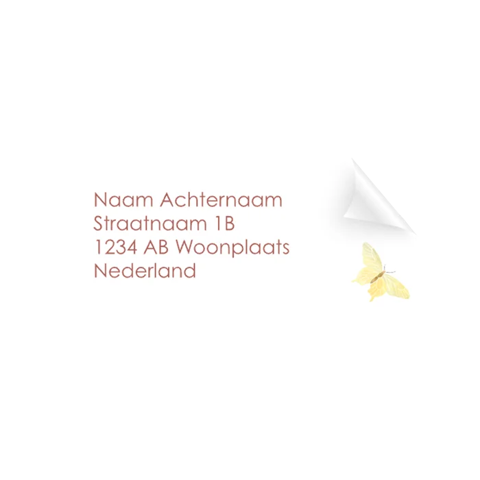 Je kunt deze adresstickers voor op de envelop met vlindertje zelf naar wens bewerken in onze editor. Je past gemakkelijk zelf de kleuren of lettertypes aan.