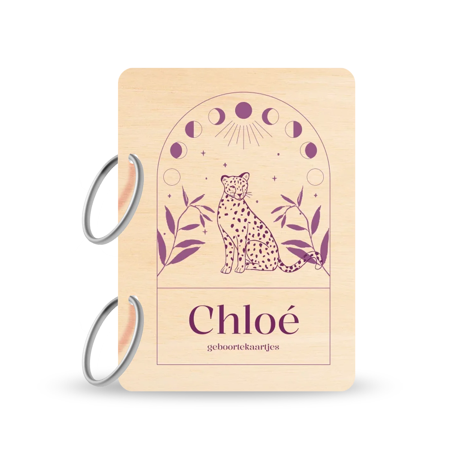Bewaarbundel voor geboortekaartje meisje van hout met cheetah