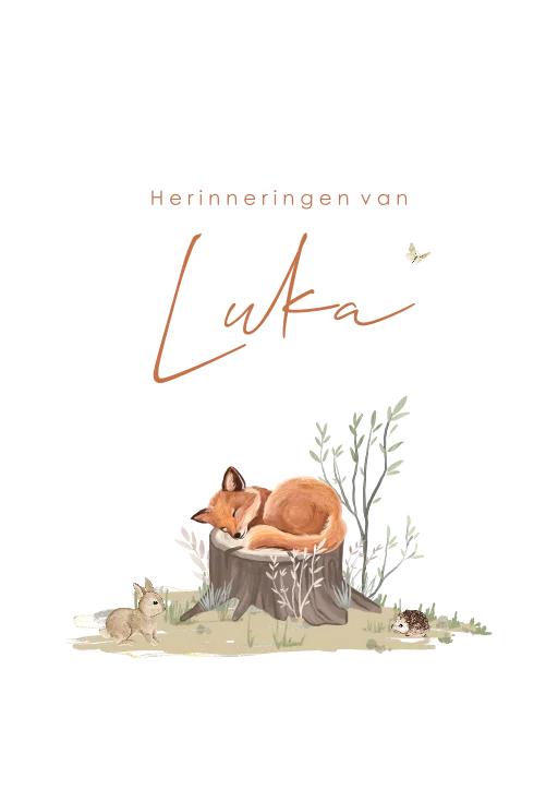 Bewaarbundel voor geboortekaartjes van hout met naam en bosdieren