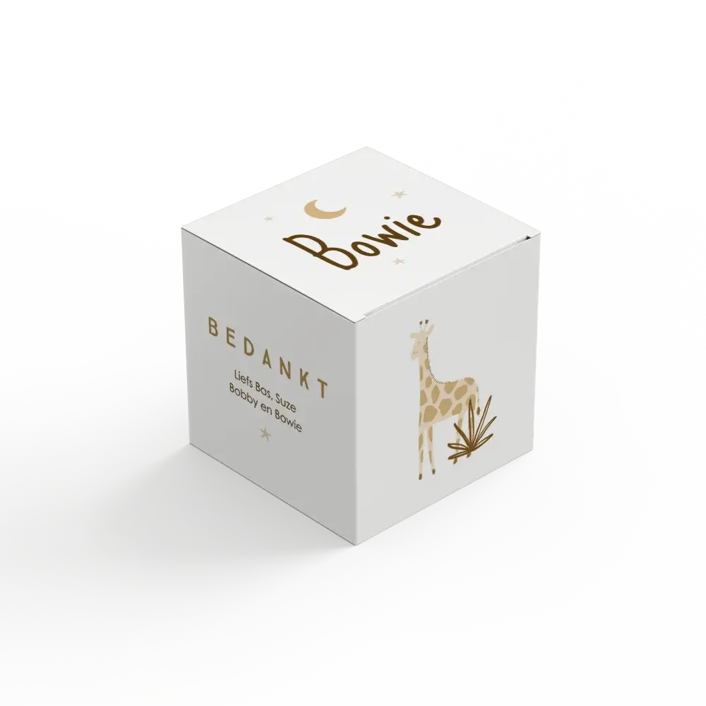 Een vrolijk kubusdoosje in de stijl van het geboortekaartje als verpakking van de doopsuikers. Hoe leuk is dat? Deze doosjes zijn 5 cm hoog, breed en diep én do-it-yourself: ze worden namelijk ongevouwen geleverd.