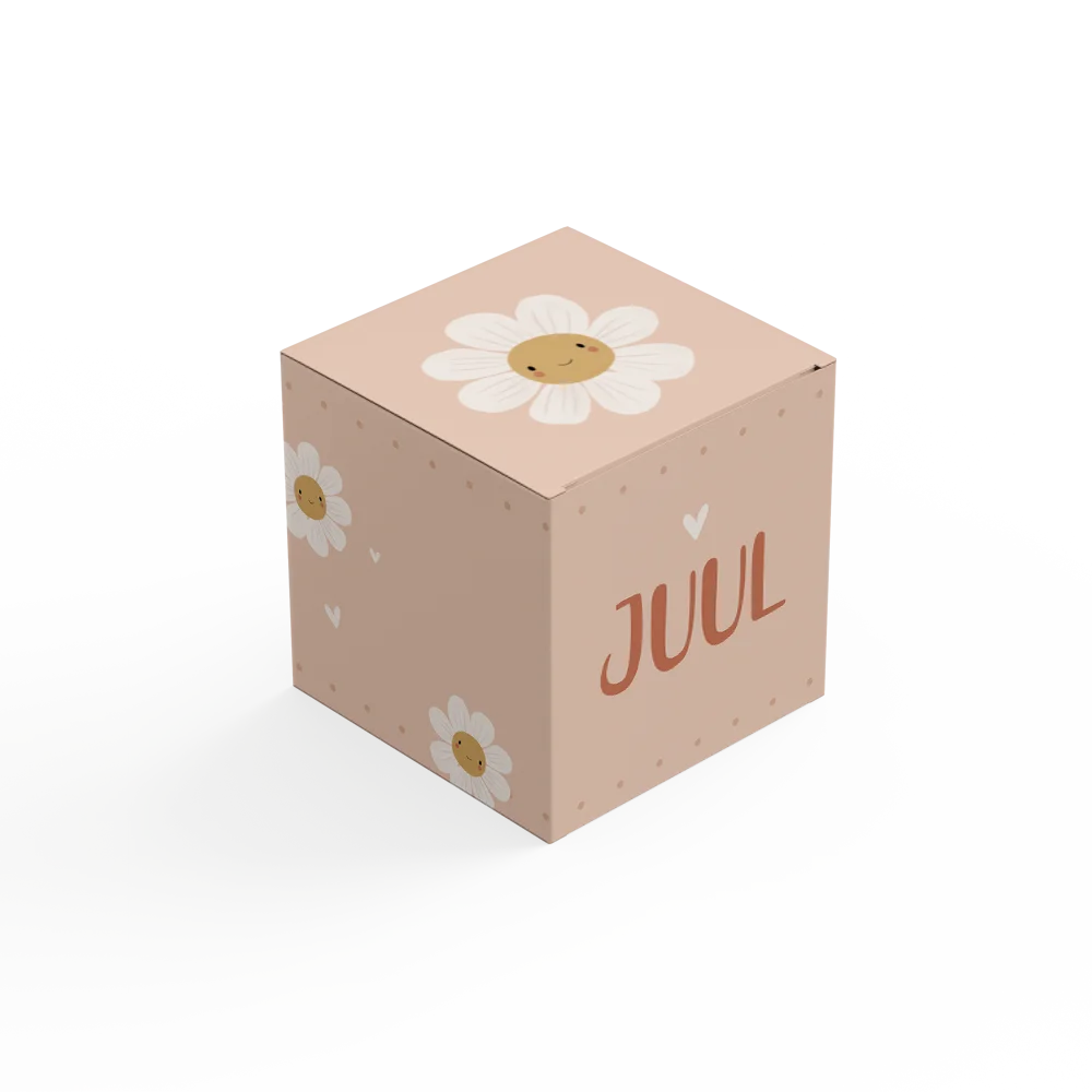 Een kubusdoosje in stijl van jullie geboortekaartje als verpakking van de doopsuikers. Hoe schattig is dat? Deze doosjes zijn 5 cm hoog, breed en diep én do-it-yourself: ze worden namelijk ongevouwen geleverd.