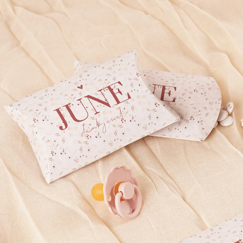 Een gondeldoosje in stijl van jullie geboortekaartje als verpakking van de doopsuikers. Hoe leuk is dat? Personaliseer de buitenzijde van het doosje en vouw 'm thuis in elkaar. Je kunt het doosje vullen met bijvoorbeeld snoepjes, koekjes of een andere verrassing. Goed om te weten: Je moet het doosje thuis zelf in elkaar vouwen en dichtplakken met bijvoorbeeld een reepje dubbelzijdig tape. Deze tape is verkrijgbaar bij de meeste hobbyzaken.