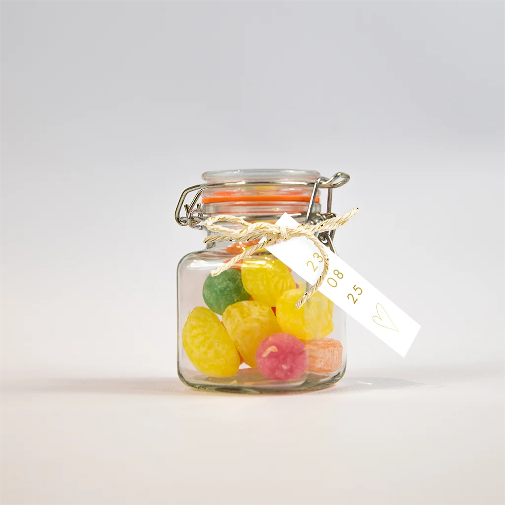 Thuis hoef je deze labeltjes in langewerpige vorm met goudfolie one line hartje enkel nog aan de doopsuiker te bevestigen met passend bevestigingsmateriaal.