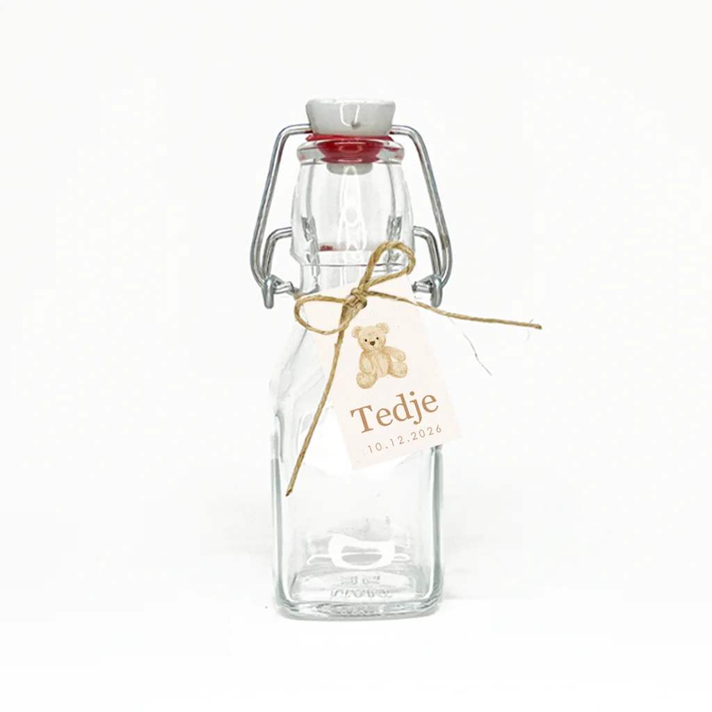 Thuis hoef je deze labeltjes met beertje enkel nog aan de doopsuiker te bevestigen met passend bevestigingsmateriaal.
