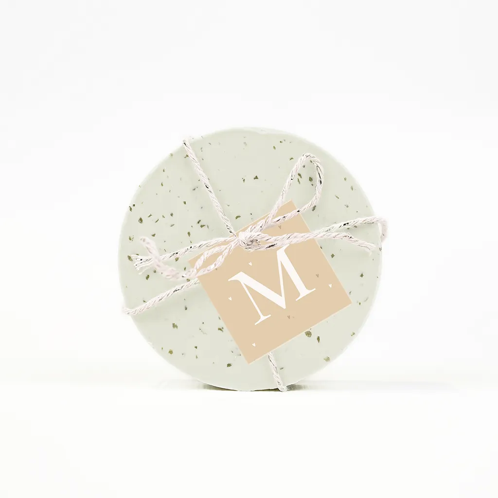 Doopsuiker label beige met initiaal en hartjes | 16 stuks