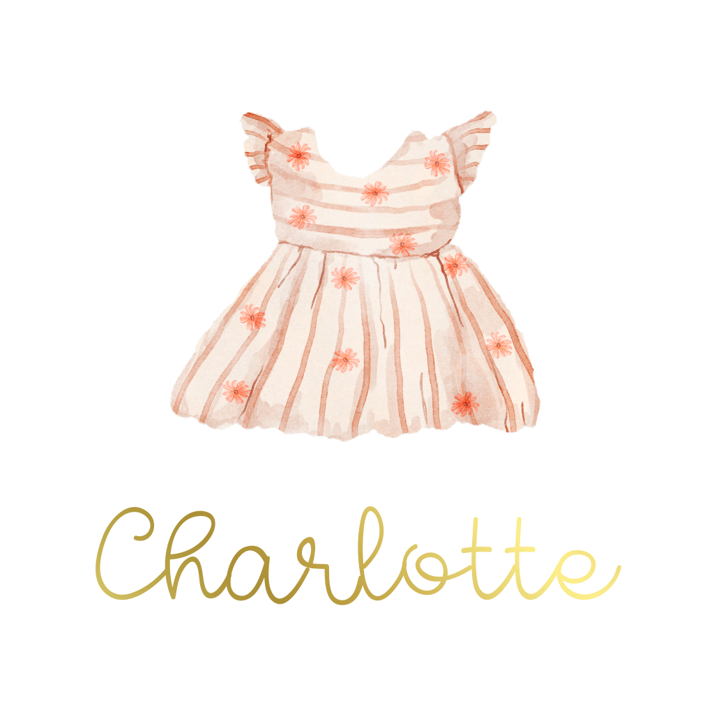 Thuis hoef deze lieve labeltjes met geïllustreerd jurkje in vierkante vorm en goudfolie enkel nog aan de doopsuiker te bevestigen met passend bevestigingsmateriaal.