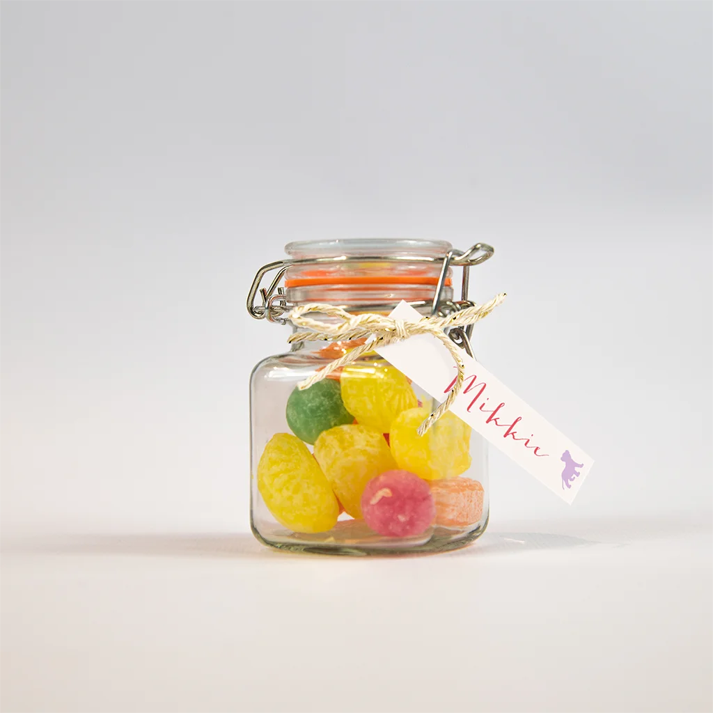 Thuis hoef je deze labeltjes in langwerpige vorm met lila welpje enkel nog aan de doopsuiker te bevestigen met passend bevestigingsmateriaal.