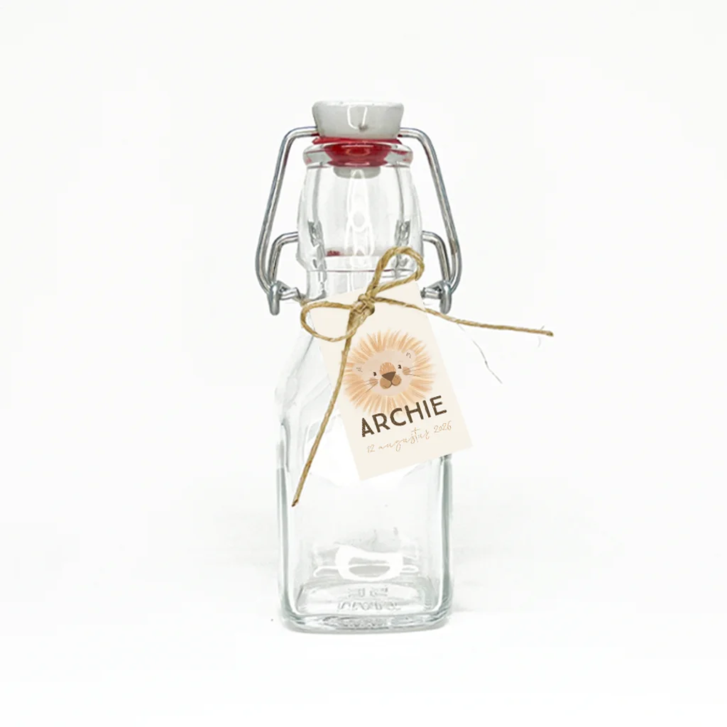 Thuis hoef je deze labeltjes in staande vorm met leeuwtje enkel nog aan de doopsuiker te bevestigen met passend bevestigingsmateriaal.