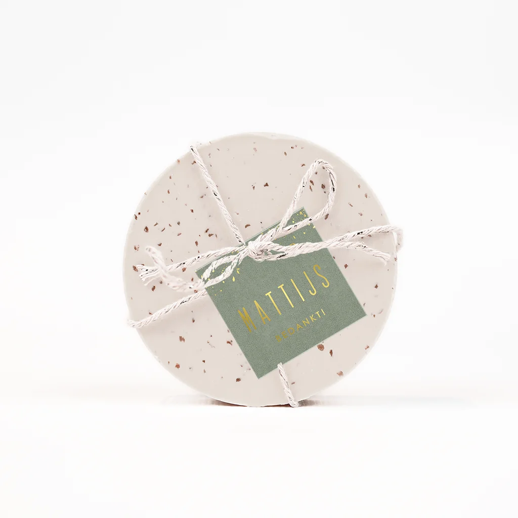 Thuis hoef deze doopsuiker labeltjes met goudfoloe blaadjes enkel nog aan de doopsuiker te bevestigen met passend bevestigingsmateriaal.