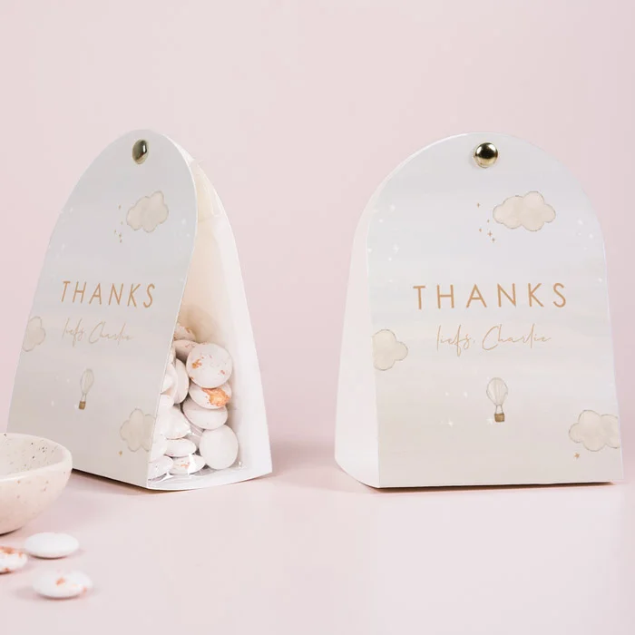 Personaliseer de buitenzijde van het snoepzakje en bestel meteen de zakjes en splitpen mee, om de doopsuikers compleet te maken. Je hoeft enkel de snoepjes nog zelf uit te zoeken en het geheel in elkaar te zetten. Heerlijk klusje tijdens je verlof!