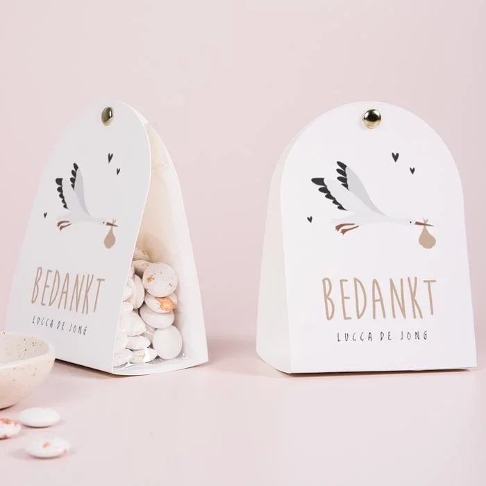 Personaliseer de buitenzijde van het snoepzakje en bestel meteen de zakjes en splitpen mee, om de doopsuikers compleet te maken. Je hoeft enkel de snoepjes nog zelf uit te zoeken en het geheel in elkaar te zetten.