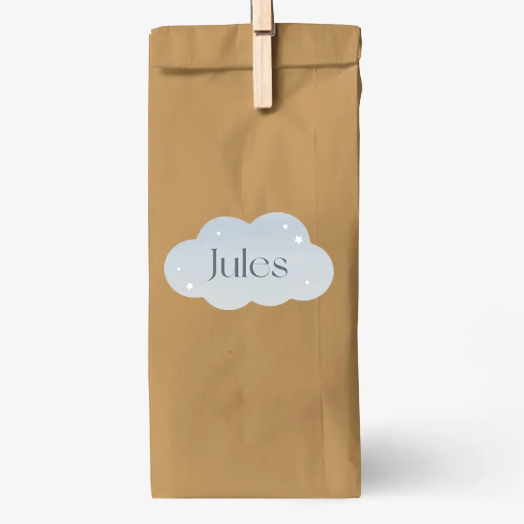 Je kunt deze doopsuikersticker in wolkvorm zelf naar wens bewerken in onze editor, pas zelf de kleuren of lettertypes aan. Thuis hoef je ze enkel nog op het doopsuiker item te plakken.