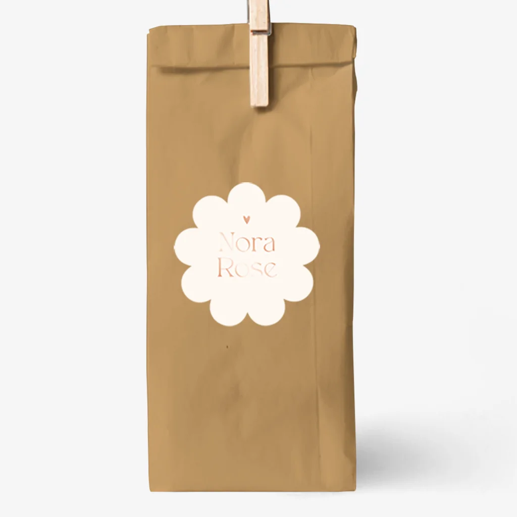 Je kunt deze doopsuikersticker in bloemvorm met roségoudfolie zelf naar wens bewerken in onze editor, pas zelf de kleuren of lettertypes aan. Thuis hoef je ze enkel nog op het doopsuiker item te plakken.