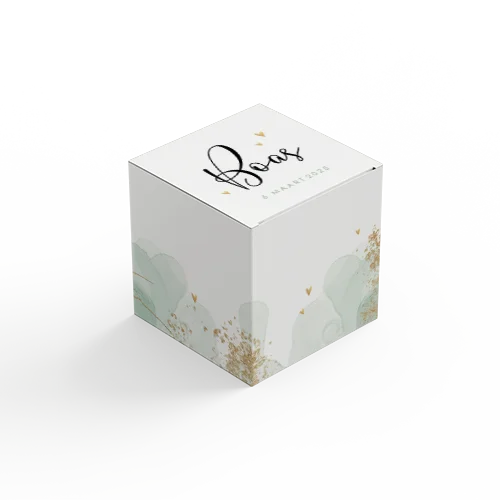 Een kubusdoosje in stijl van je geboortekaartje als verpakking van de doopsuikers. Hoe leuk is dat? Deze doosjes zijn 5 cm hoog, breed en diep én do-it-yourself: ze worden namelijk ongevouwen geleverd.