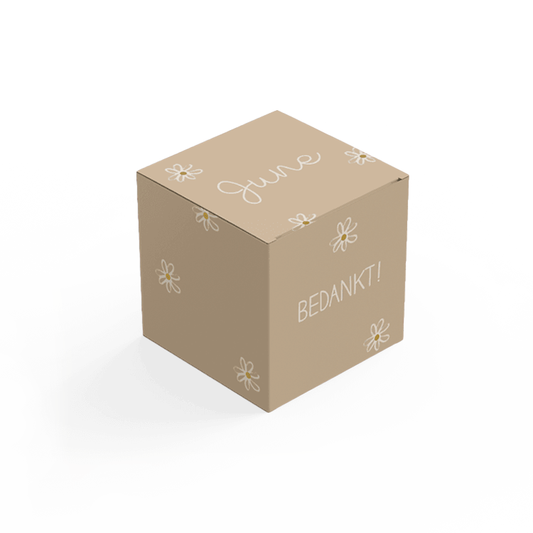 Een kubusdoosje met eendje in stijl van je geboortekaartje als verpakking van de doopsuikers. Hoe leuk is dat? Deze doosjes zijn 5 cm hoog, breed en diep én do-it-yourself: ze worden namelijk ongevouwen geleverd.