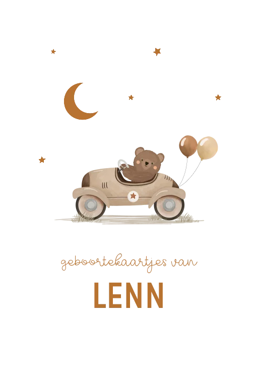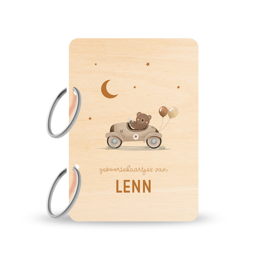 Houten bewaarbundel met beertje in auto en ballonnen