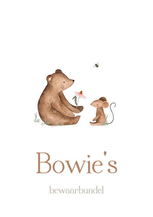 Lief beertje en muisje op een prachtige houten bewaarbundel voor geboortekaarten. Deze bewaarbundel is gemaakt van multiplex hout, heeft afgeronde hoeken en twee metalen ringen. Je kunt de voorzijde van de bundel naar wens personaliseren in de editor. Zo onwijs leuk!