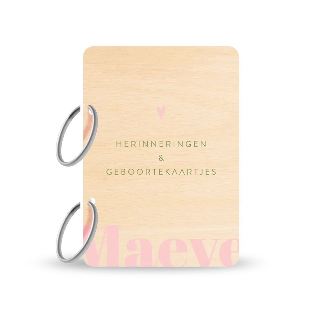 Tekst in colorblocking in roze en groen op een prachtige houten bewaarbundel voor geboortekaarten. Deze bewaarbundel is gemaakt van multiplex hout, heeft afgeronde hoeken en twee metalen ringen. Je kunt de voorzijde van de bundel naar wens personaliseren in de editor. Zo onwijs leuk!