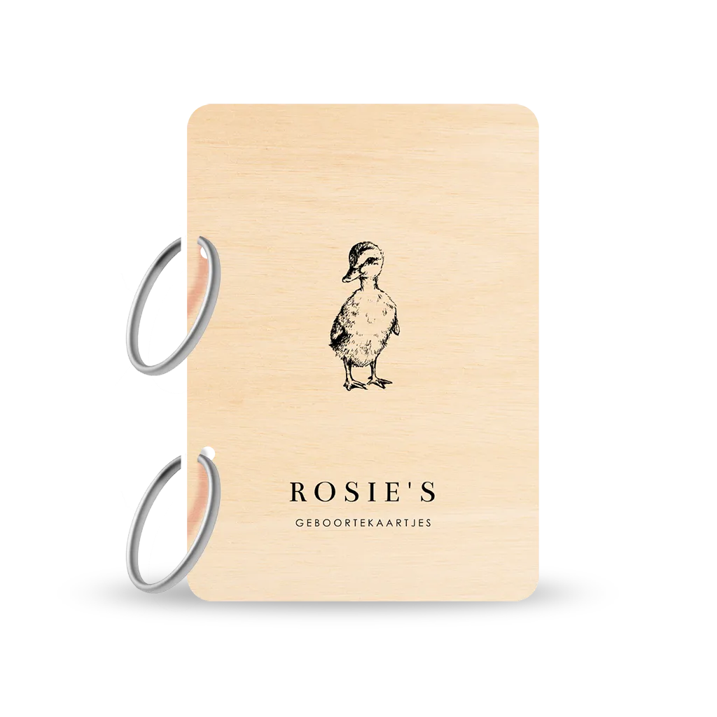 Een schattig eendje op een prachtige houten bewaarbundel voor geboortekaarten. Deze bewaarbundel is gemaakt van multiplex hout, heeft afgeronde hoeken en twee metalen ringen. Je kunt de voorzijde van de bundel naar wens personaliseren in de editor. Zo onwijs leuk!