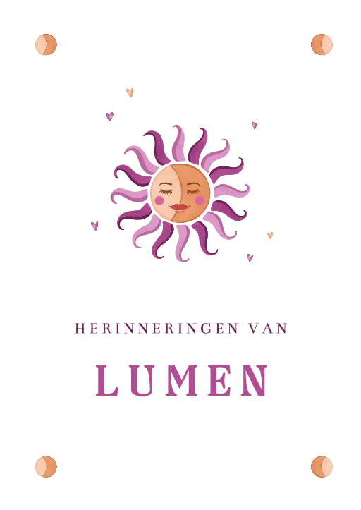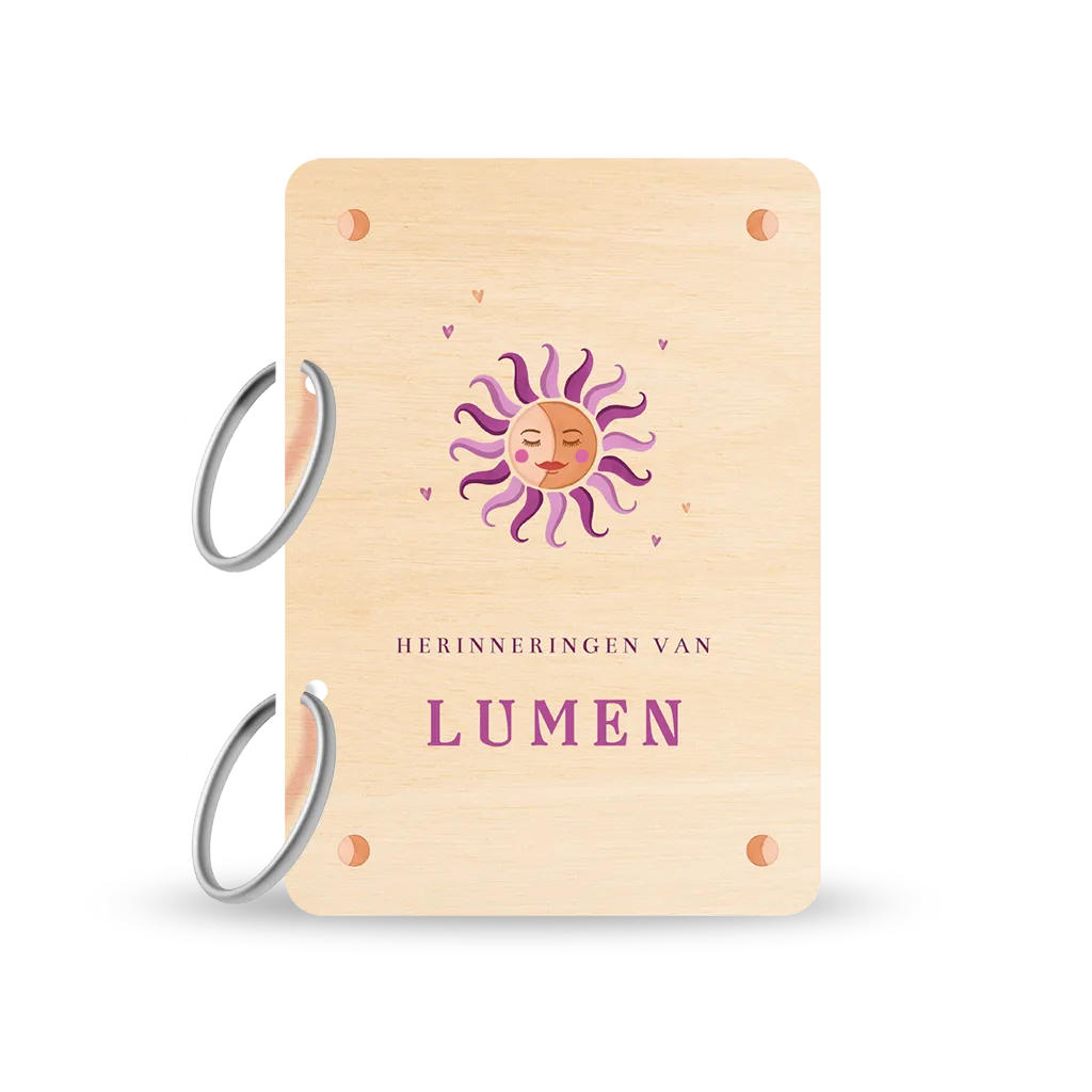 Mooie zon in lilatinten op een prachtige houten bewaarbundel voor geboortekaarten. Deze bewaarbundel is gemaakt van multiplex hout, heeft afgeronde hoeken en twee metalen ringen. Je kunt de voorzijde van de bundel naar wens personaliseren in de editor. Zo onwijs leuk!